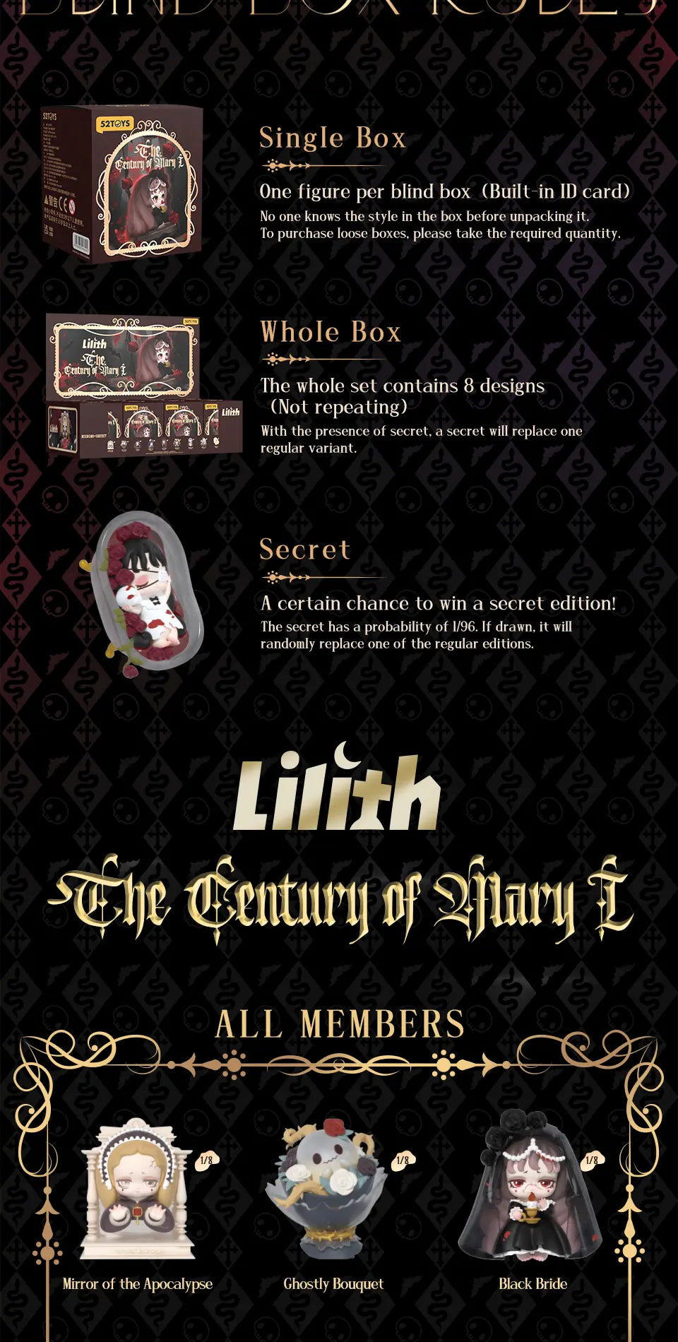 A blind box is a product where you won’t know which edition is inside until you open it. When you purchase a whole set, any regular edition may be replaced by a secret edition if it appears.