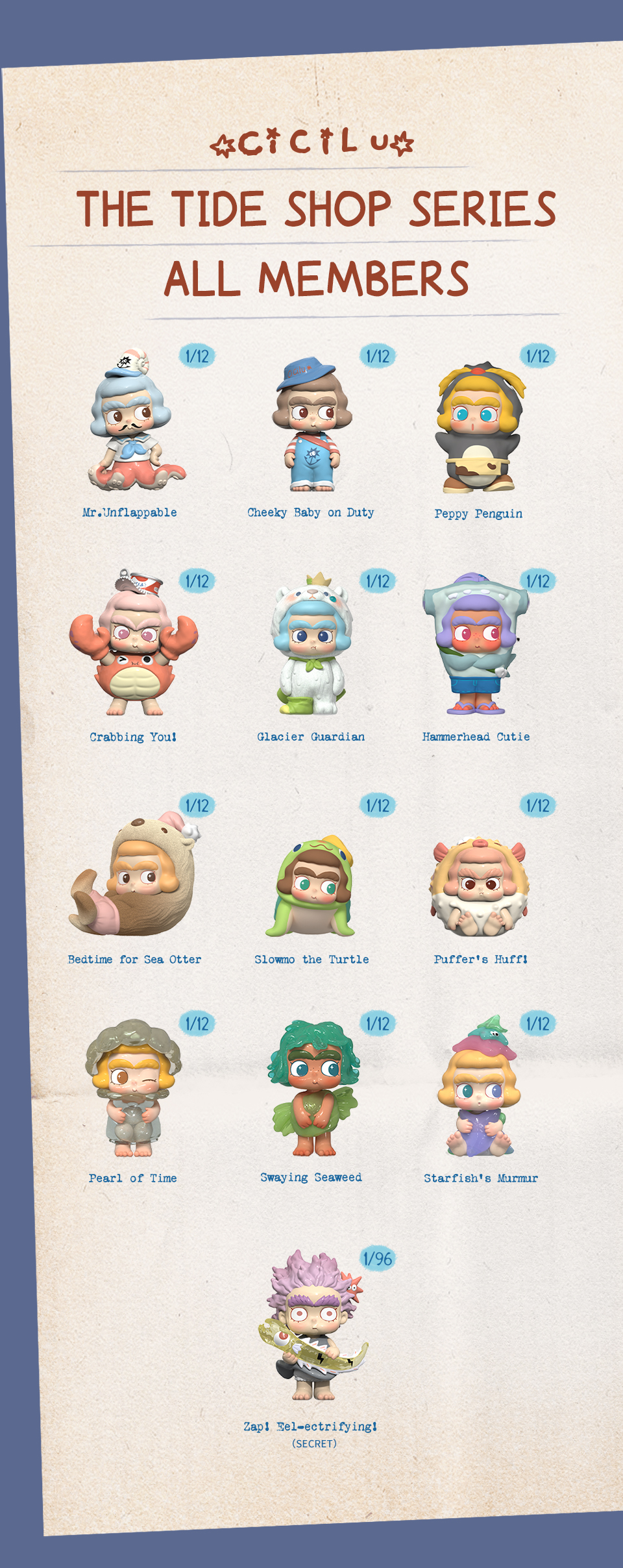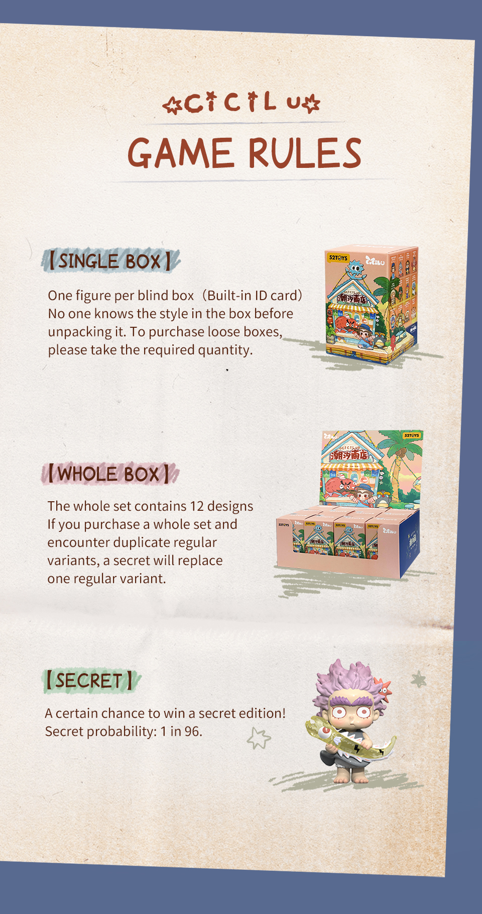 A blind box is a product where you won’t know which edition is inside until you open it. When you purchase a whole set, any regular edition may be replaced by a secret edition if it appears.