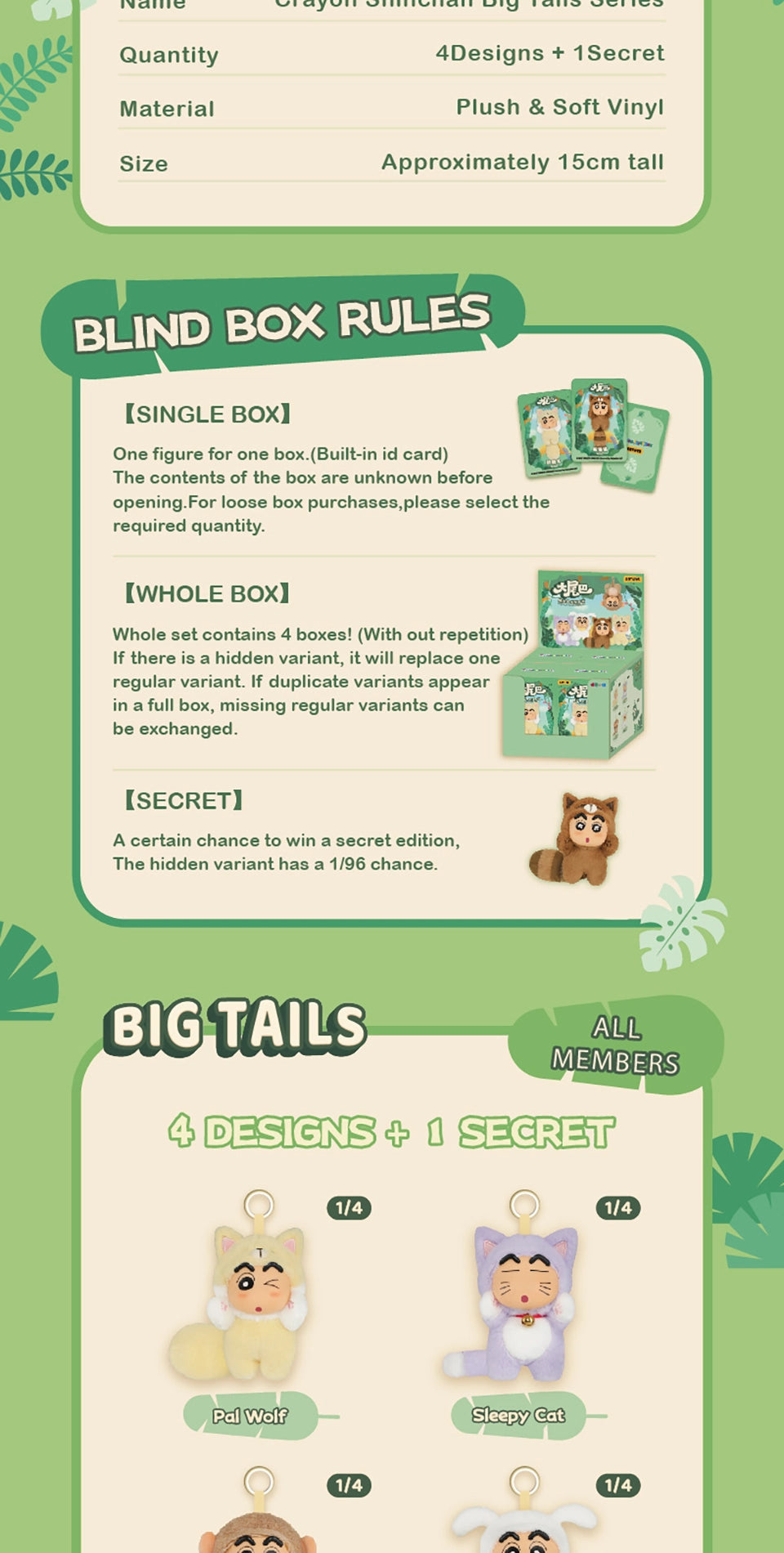 A blind box is a product where you won’t know which edition is inside until you open it. When you purchase a whole set, any regular edition may be replaced by a secret edition if it appears.