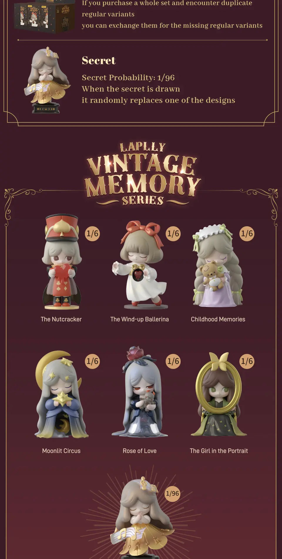 A blind box is a product where you won’t know which edition is inside until you open it. When you purchase a whole set, any regular edition may be replaced by a secret edition if it appears.