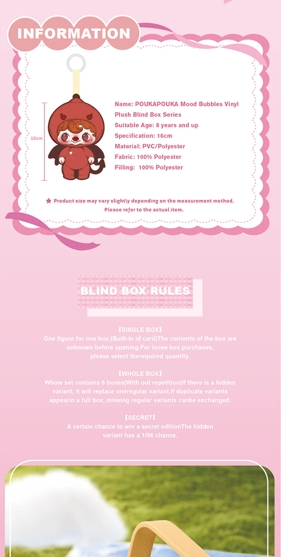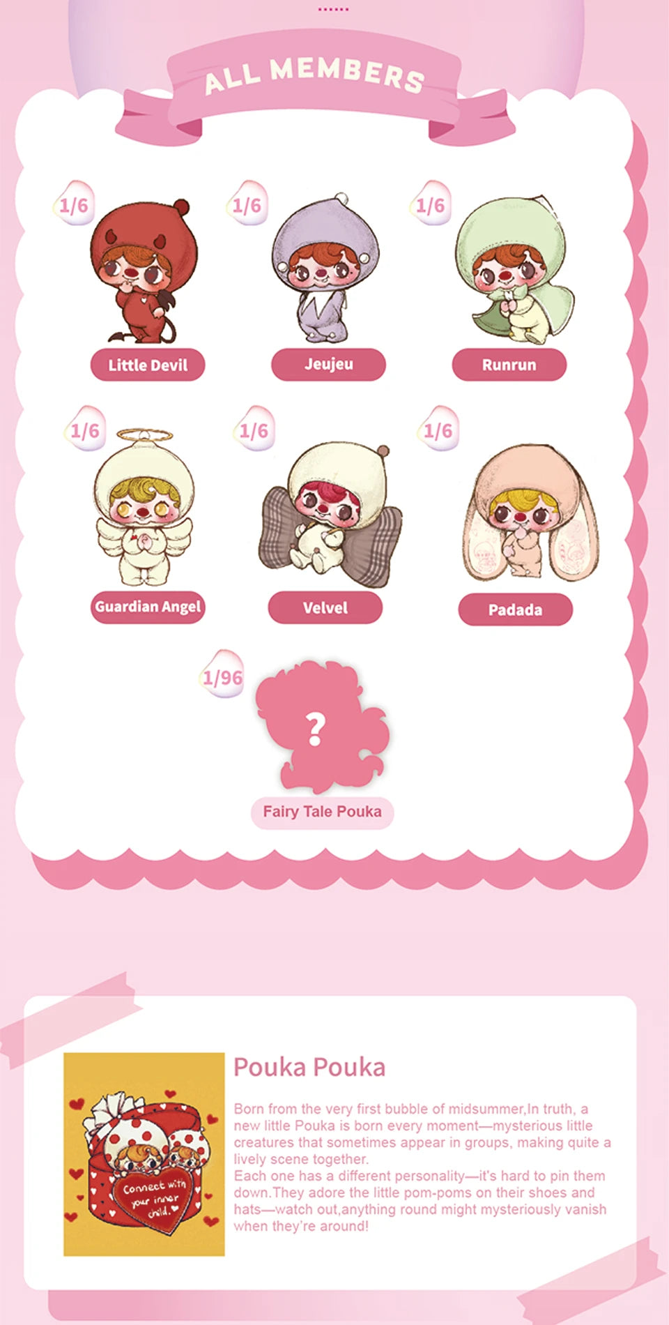 A blind box is a product where you won’t know which edition is inside until you open it. When you purchase a whole set, any regular edition may be replaced by a secret edition if it appears.